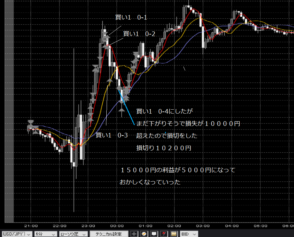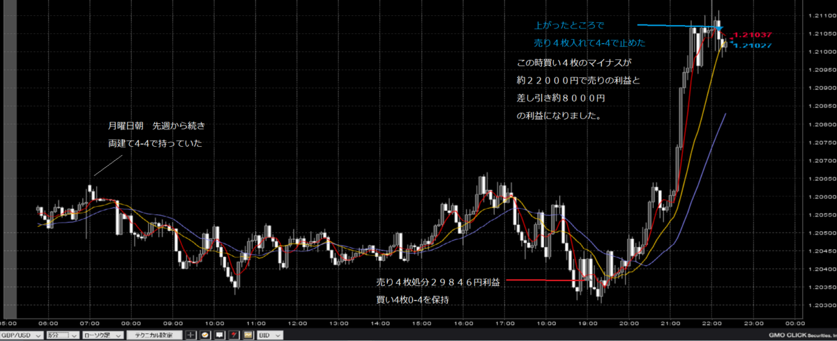 金曜日の朝、下がったので上がると思い買いを2枚入れて